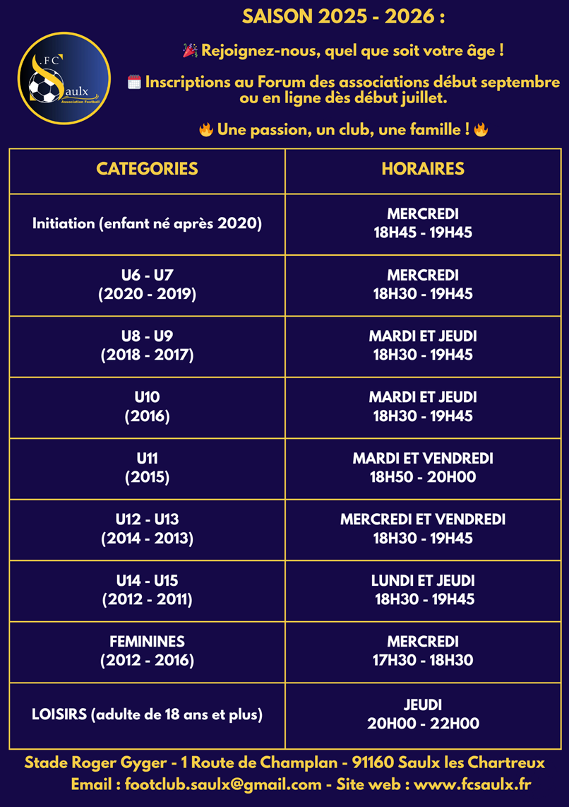 Pour la saison à venir, vous trouverez ci-dessous le planning des entrainements, tarifs et équipement en fonction de l'année de naissance du ou de la licencié(e).
